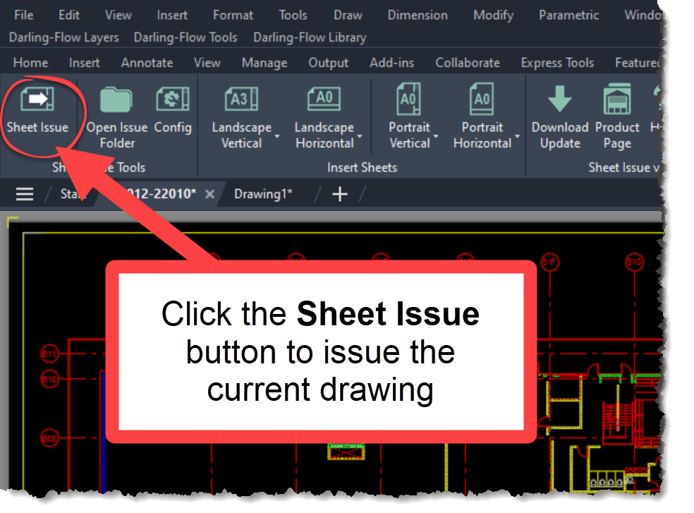 Ensure you have a compatible title sheet open in AutoCAD and click the Sheet Issue button as shown below to issue the drawing.