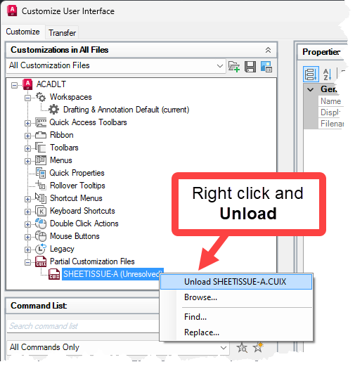 Open the Partial Customization Files area - if the Sheet Issue menu is listed (it may show unresolved), right click on it and select Unload Sheet Issue-A.CUIX.