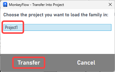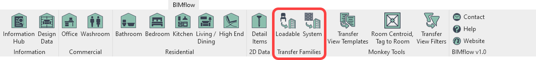 Tools are provided for transferring both Loadable and System type families from the warehouse files into your project Revit files.