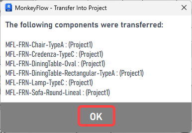 Finally you will receive another dialogue reporting the items that have been transferred to your project as below, click OK to complete.