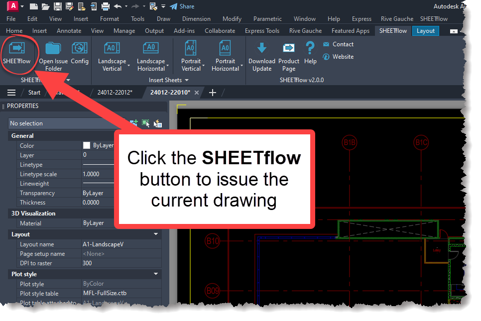 Ensure you have a compatible title sheet open in AutoCAD and click the SHEETflow button as shown below to issue the drawing.