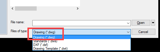 Important - Once the file has been edited ensure you reset your Files of type from the Select File (Open) dialogue, back to Drawing (*.dwg) as shown below: