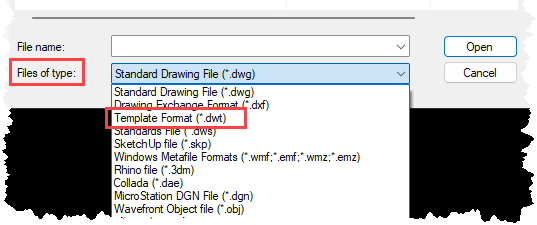 2. From the Open file dialogue set Files of type to Template Format (*.dwt) as shown below - this will allow the viewing of DWT files.