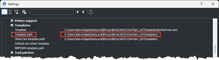4. Assuming you have followed the instructions above, to find the location of your Template files do the following - from the BricsCAD command line enter OPTIONS to open the Settings dialogue, click the + symbols to navigate to the Program options> Files>Template path as shown below.