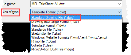 Important - Once the file has been edited ensure you reset your Files of type from the Select File (Open) dialogue, back to Standard Drawing File (*.dwg) as shown below: