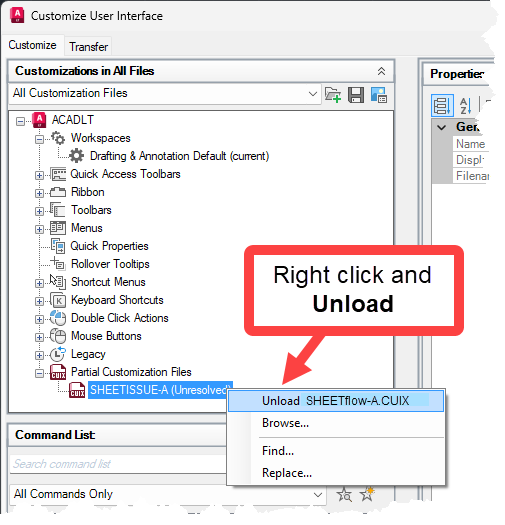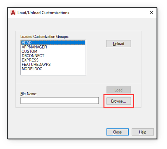 6. Type MENULOAD on the AutoCAD command line to open the Load / Unload Customization dialogue box.