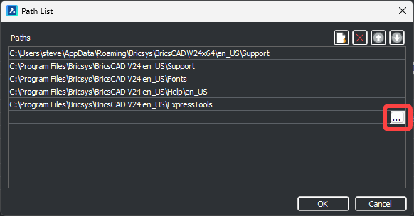 ![]() From the Path List dialogue, click the … button at the end of the bottom blank line as shown: