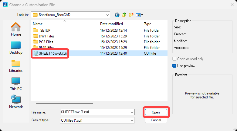 ![]() Select SHEETflow-B.CUI and click Open as screenshot below to return to the Customization Groups dialogue.