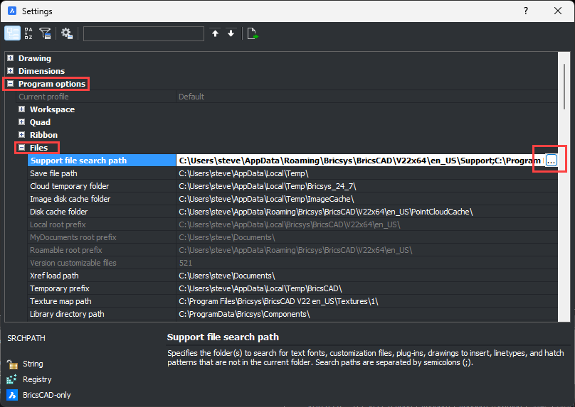BricsCAD users only to proceed with step No.9 - skip to step No.14 if using AutoCAD9. From the Settings dialogue open Program options> Files as shown and click the … button at the end of the Support File Search Path line to open the Path List dialogue.