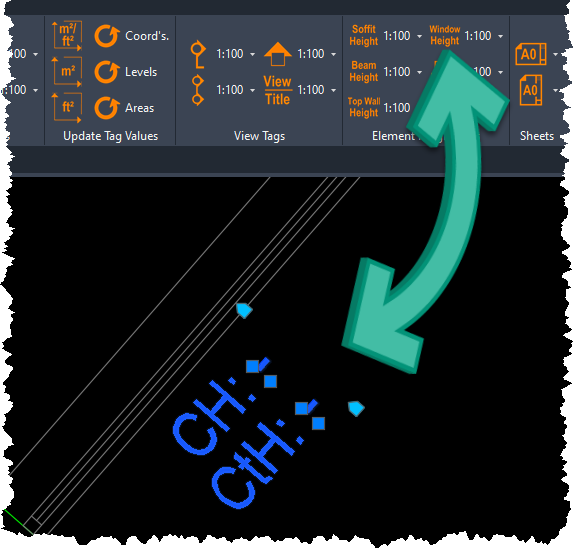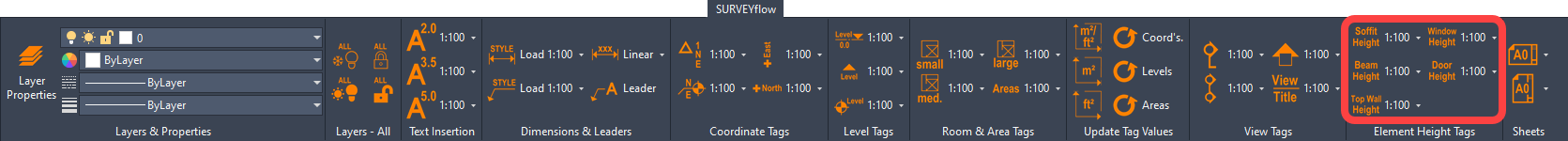 Building element height tags can be instantly added from the Element Height Tags panel.