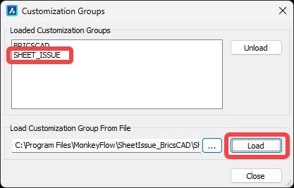 Once Sheet Issue is displayed in the Loaded Customizations Groups list, click Close to return to the AutoCAD screen.