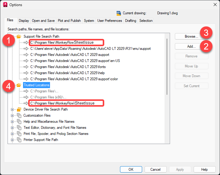 AutoCAD users only to proceed with step No.3 - skip to step No.9 if using BricsCAD3. From the Files tab click on the + symbol next to Support File Search Path (no.1 below), select Add (no.2) then Browse (no.3), and navigate to: